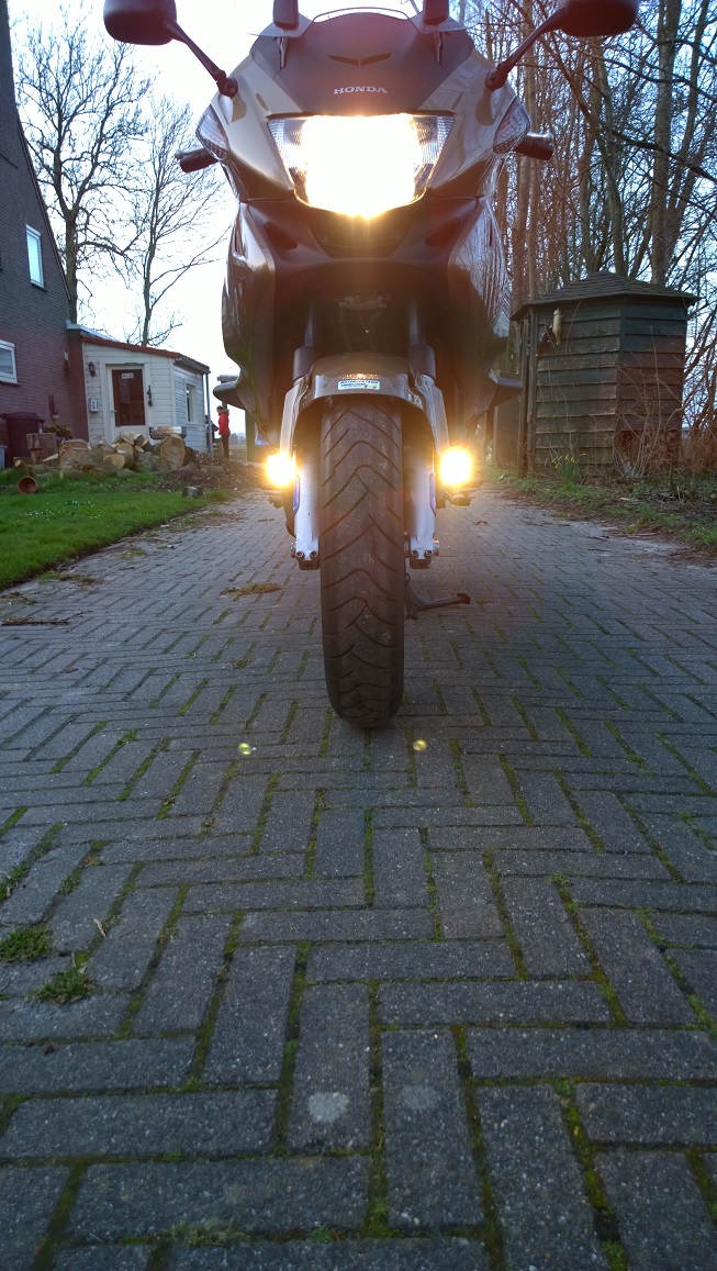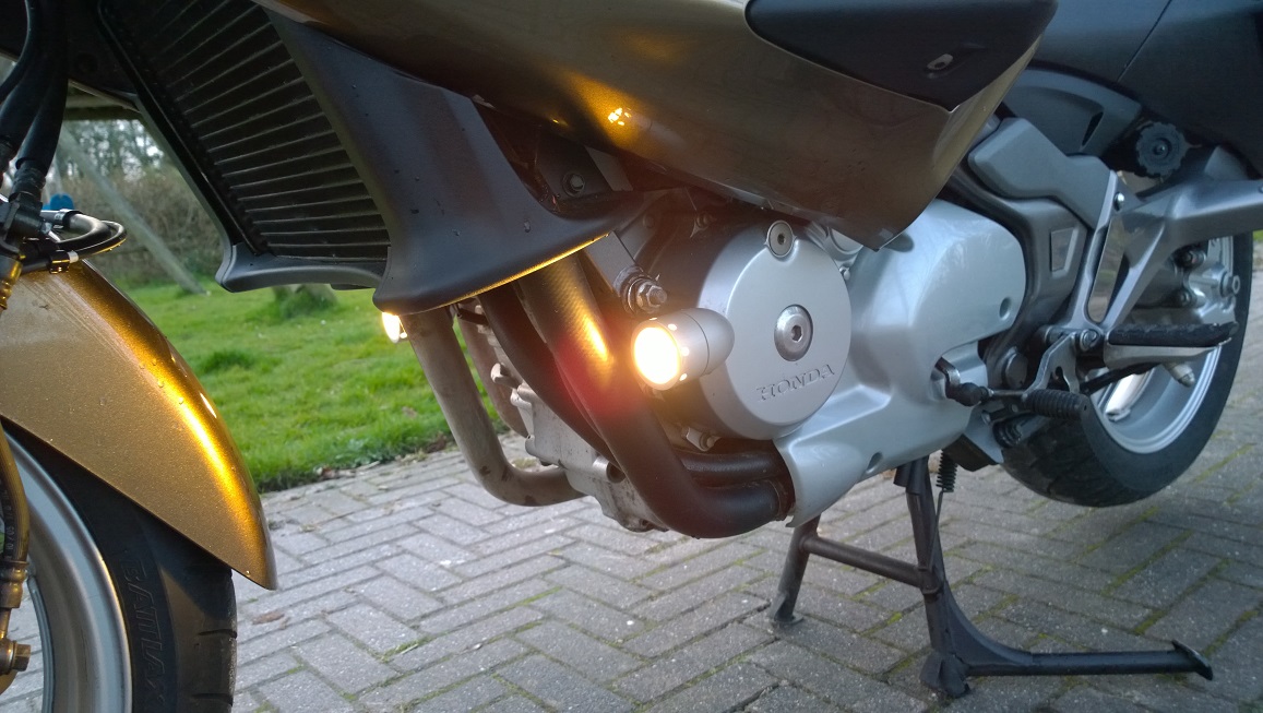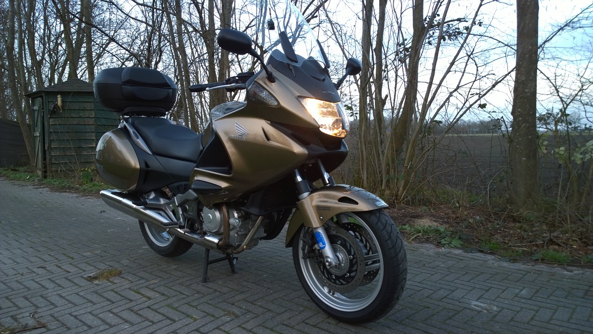 Ik heb er wat kleine aanpassingen aan laten doen. Een topkoffer (origineel Honda), een 12V (BMW) stekker aan de zijkant (makkelijk voor de acculader) en twee extra koplampen. Eigenlijk had ik de standaard Honda Deauville lampen erop willen hebben, maar deze bleken moeilijk verkrijgbaar. De importeur had ze niet meer, en een rondje bellen langs andere dealers leverde alleen aangebroken verpakkingen op, dus ontbrekende lampjes, houders, kabels etc. Daarom zit er nu maar een algemene lampenset op, en dat bevalt ook prima. Het is gekoppeld aan het grootlicht, en ’s avonds door de polder rijden is nu echt een plezier, deze set schijnt zeker 500 meter vooruit, en da’s heel prettig.