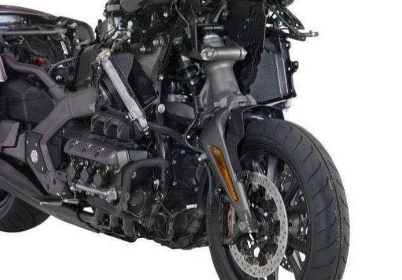 Er is ook een foto vrijgegeven (gelekt?) zonder kuipwerk. Duidelijk zicht baar is de nieuwe motor, maar wat ook opvalt is de nieuwe voorwielophanging. Er wordt geen gebruik gemaakt van traditionele vorkpoten, maar het lijkt wel op de Telelever voorvering van grote concurrent BMW. Qua design moet ik ook denken aan de Yamaha GTS1000, maar dat was enkelzijdig natuurlijk.