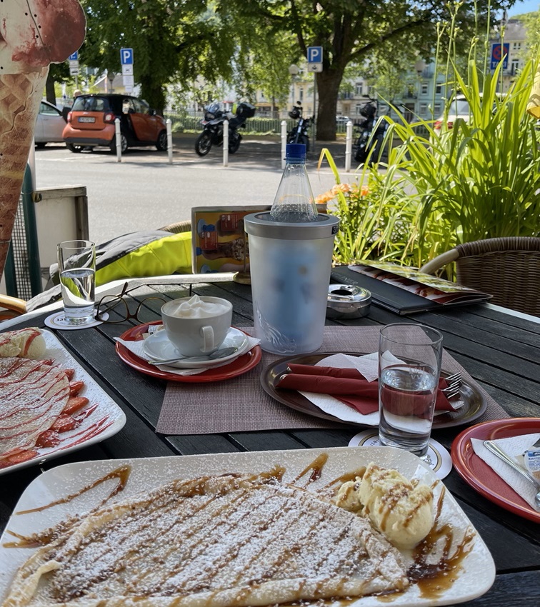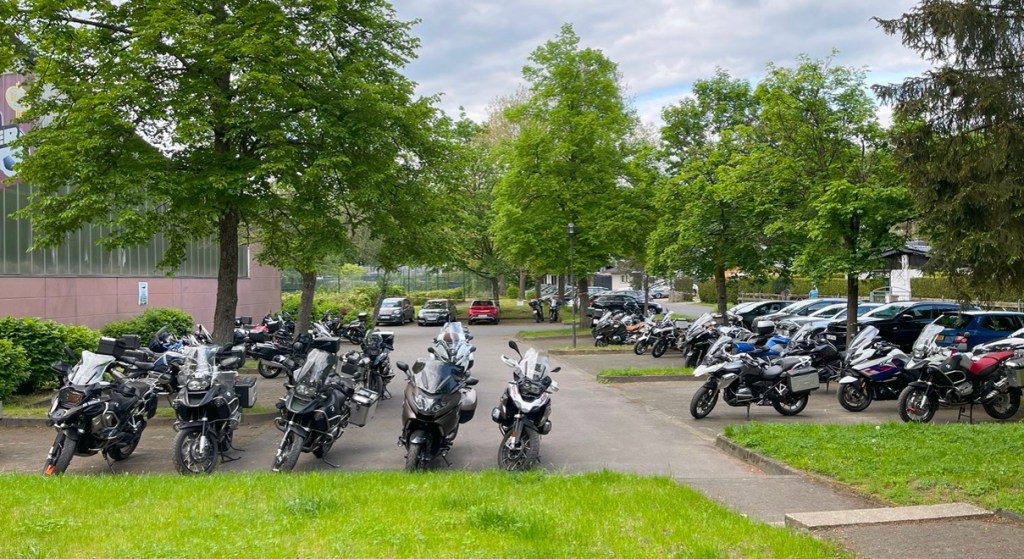 Wat voor mij nog wel een probleem is…. Ik heb een nieuwe navi gekocht. De BMW Navigator VI ligt in de kast en een nieuwe Connected Ride Navigator zit op de motor. Het is niet handig als je die net een paar dagen hebt en dan met geimporteerde routes gaat rijden. Maar goed, verdwaald zijn we nooit. En je kan altijd wel ergens rustig zitten en van een versnapering genieten. Let ook op de parkeerplaats voor motoren. Niet zichtbaar maar wel aanwezig, een bord met “Biker Herzlich Willkommen”, dit was in Bad Ems aan de oever van de rivier Lahn.